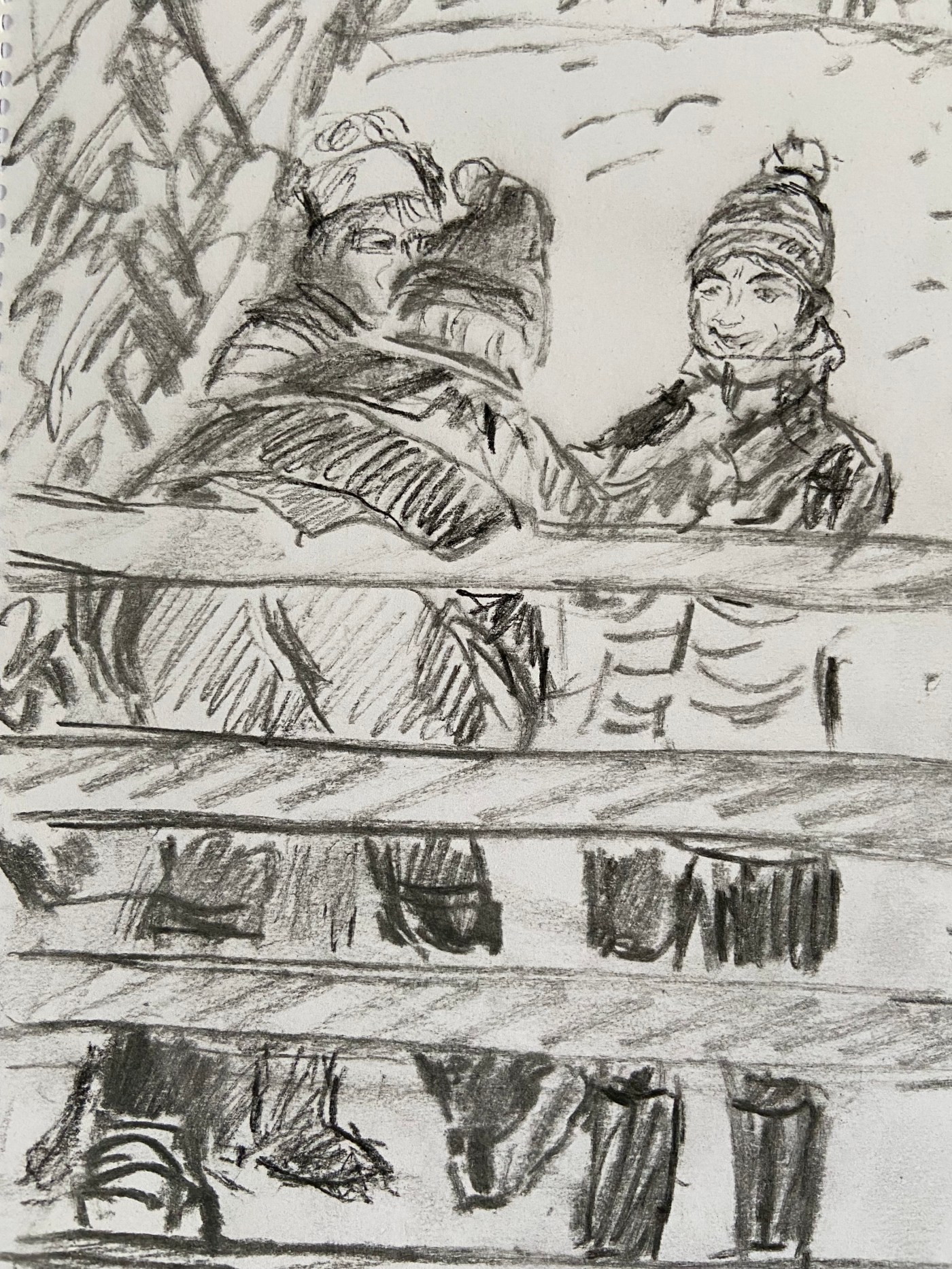 Whilst on walk in Tatton Park this winter a friend, on climbing over a gate caught her coat and was, for a few moments, left hanging there. It was funny enough to etch the image into my mind, and so later I drew it from memory!