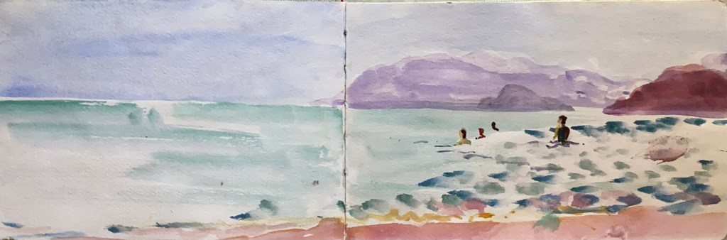 A quick evening sketch with turtle island just visible against the lighter lilac hills.