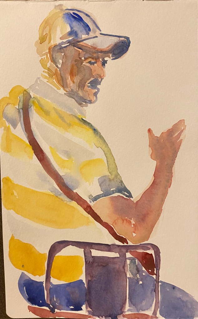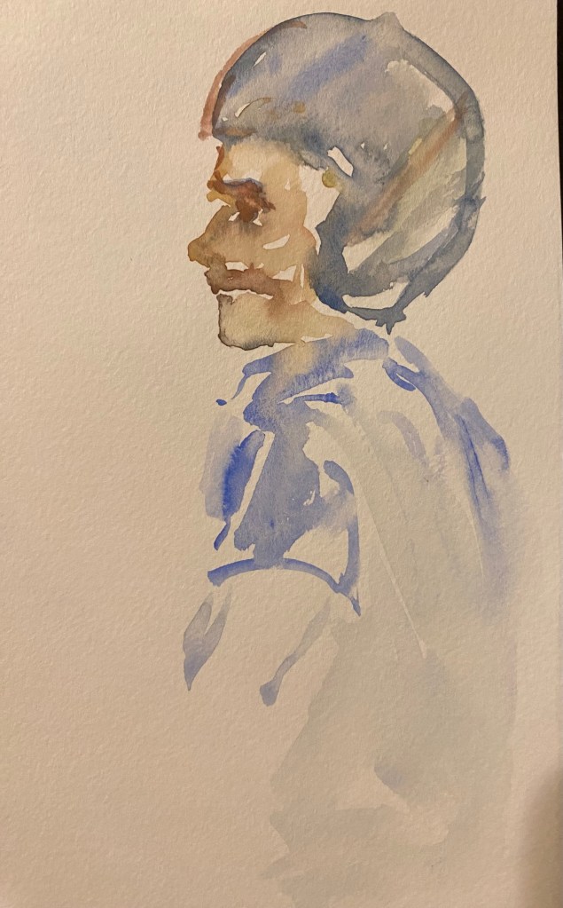 The man in this picture got up to leave just as I’d begun. However the man whom he’d been talking to told him I’d started painting him so he perched back on his stool for several more minutes, sometimes people are surprisingly kind!