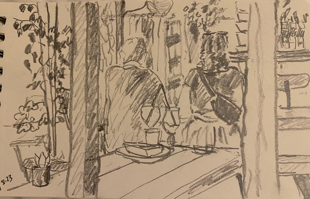 A couple at the local café, despite having their backs to me it was the straws touching sweetly in the 2 glasses behind them that inspired me.